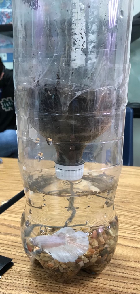 There are no signs of any grass growing on top, but we did just put this together this week. Concerning the water there are no changes in amount, color, etc. There’s also no algae on top of the surface of the water. Nothing has changed except for the fact that we did add a fish yesterday afternoon.
